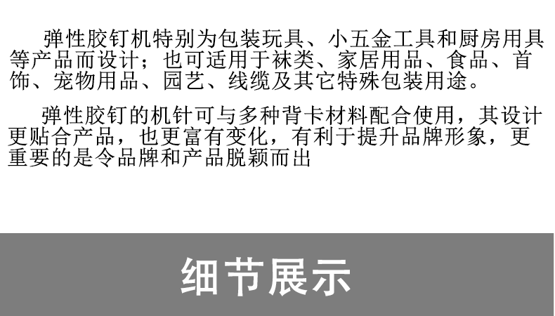 l 彈性膠釘機特別為包裝玩具、小五金工具和廚房用具等產品而設計;也可適用于襪類、家居用品、食品、首飾、寵物用品、園藝、線纜及其它特殊包裝用途。